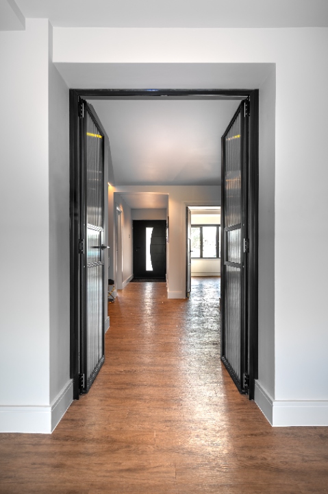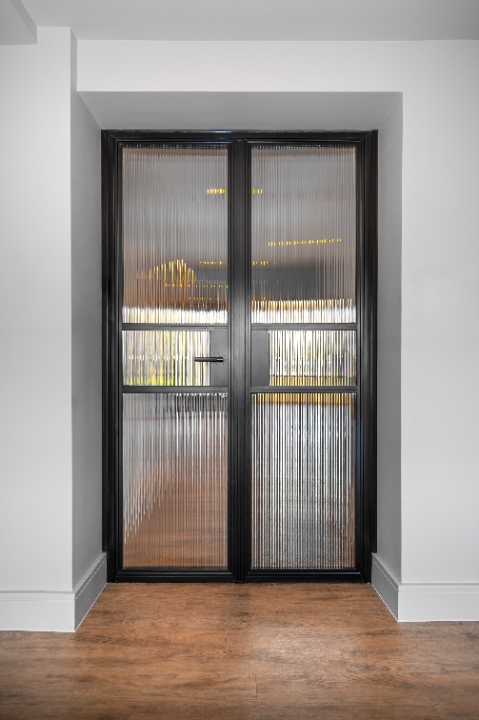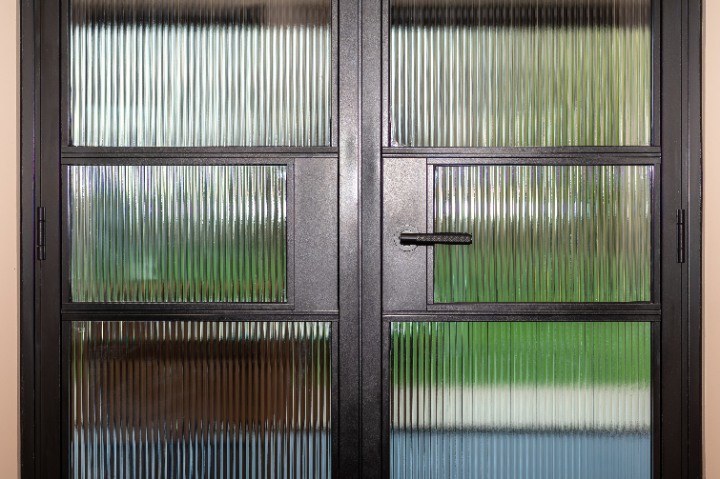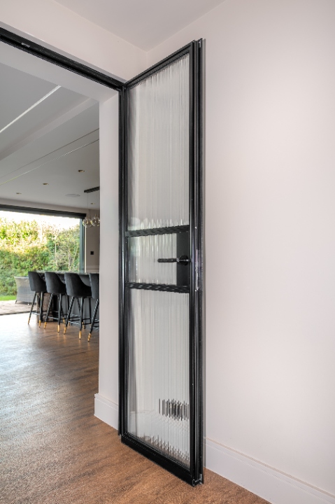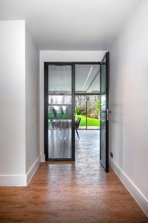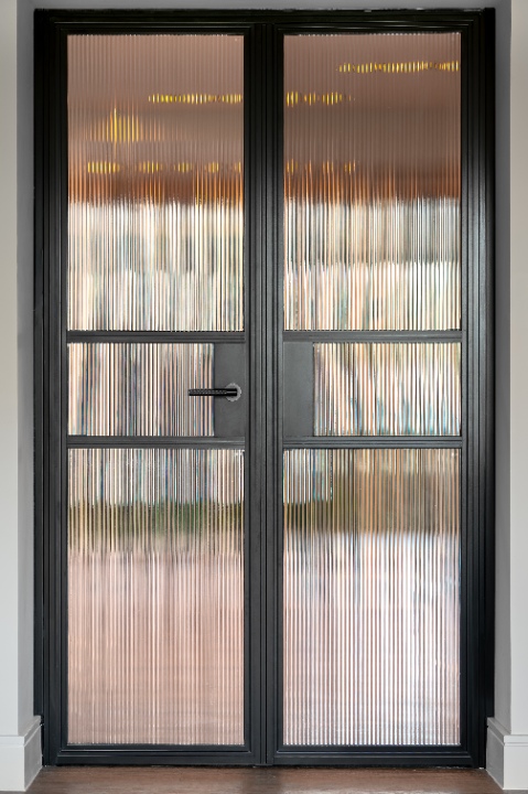 Inside, the Heritage aluminium French doors continue the modern aluminium theme while offering a classic look. Reeded toughened glass lets light pass between rooms while keeping a level of privacy.